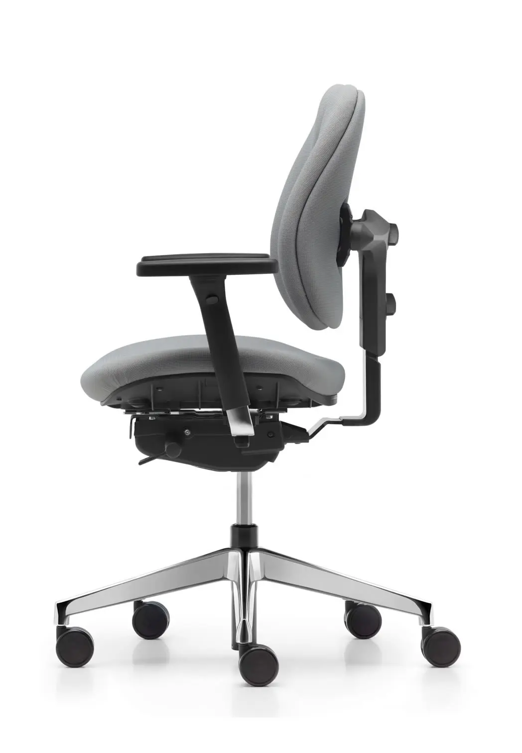 Technik unverändert stark: Höhen- und breitenverstellbare Rückenflügel entlasten die Lendenwirbelsäule um über 50% und unterstützen dynamisches Sitzen wie beim Modell mit Kunststoffrücken.