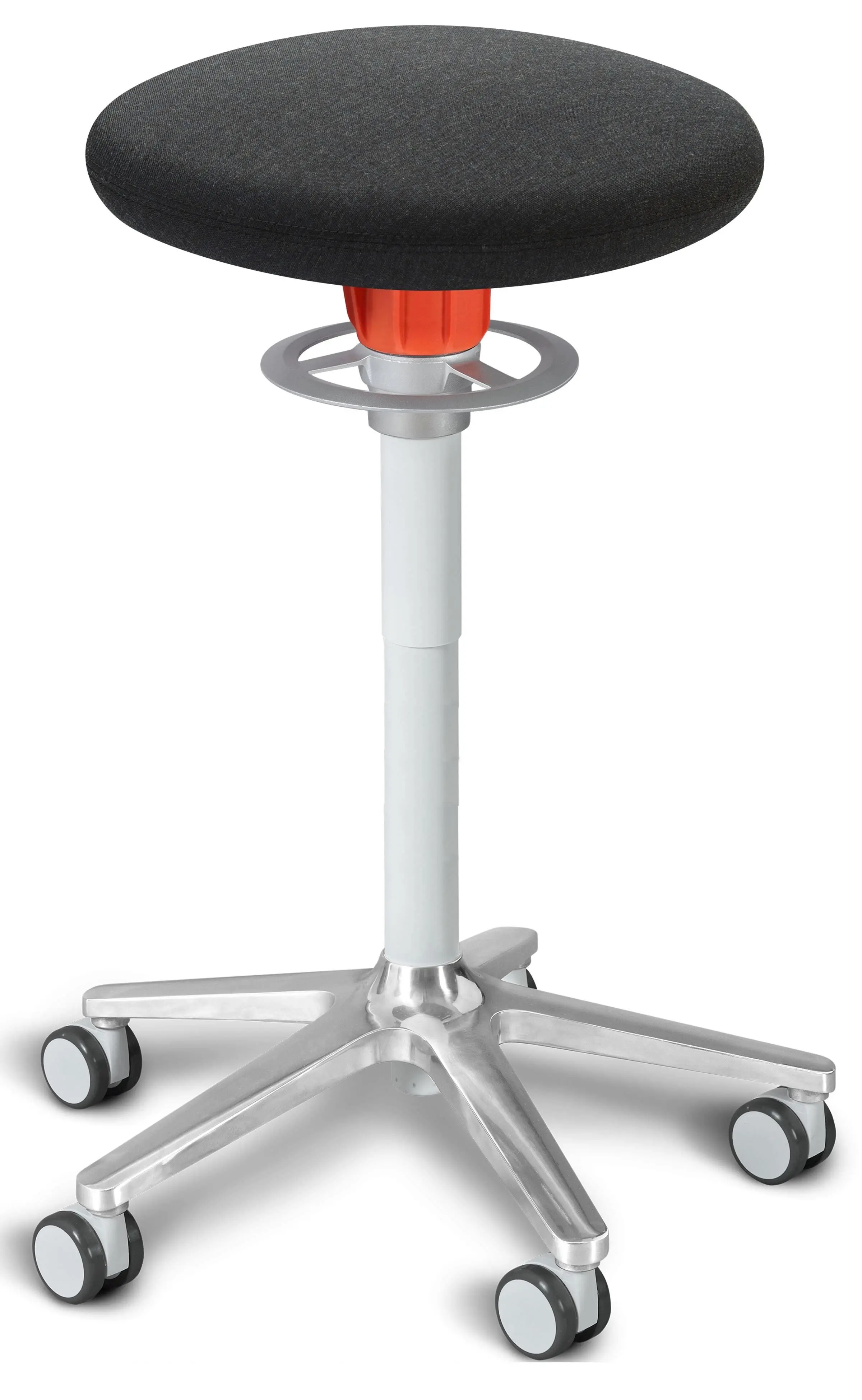 Design Rollhocker: -- Hocker mit Rollen hoch aus Kunststoff in schwarz/weiß, - Sitzhöhe regular 52-63cm oder tall 59-77cm, - mit Rollen für alle Böden Büro - Zuhause geeignet, - gebremste Rollen 2 mit manueller Feststellung, - einfache Höhenverstellung durch Gasdruckfeder und 360°-Verstellring, 5-armiges Fußkreuz (Ø 53,5 cm) in Alu poliert, - made in Germany. Kundenspezifische Bestellung.